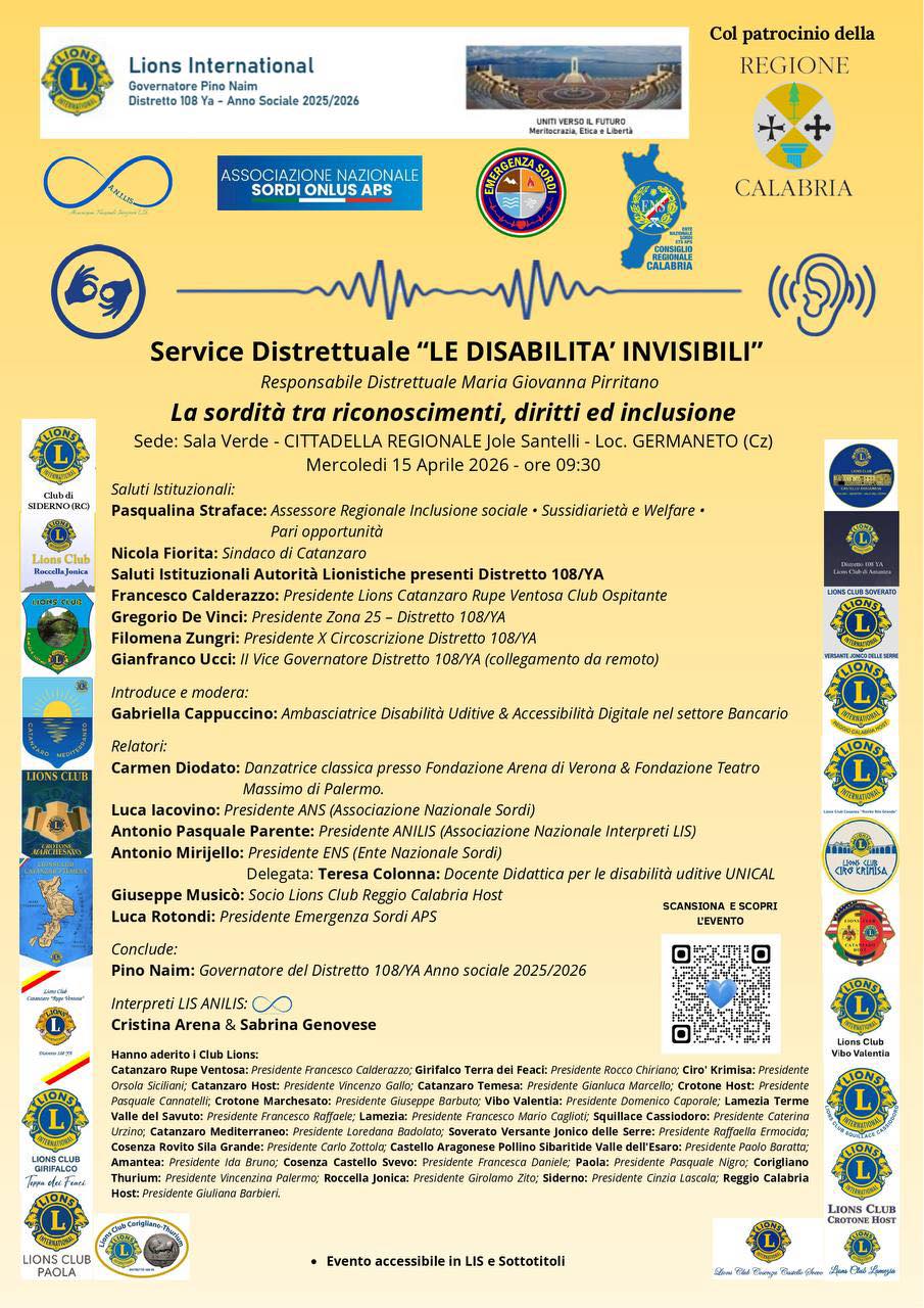 Il Lions Club Catanzaro Rupe Ventosa ospita il convegno promosso da Lions Clubs International – Distretto 108 Ya, dedicato al tema delle disabilità invisibili, con particolare attenzione alla sordità, ai diritti delle persone e ai percorsi di piena inclusione sociale.